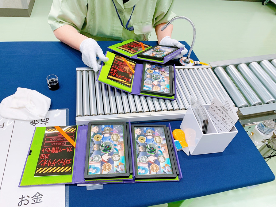 最後に、キャラクターがデザインされた台紙にプルーフ貨幣と初号機メダルがセットされ、