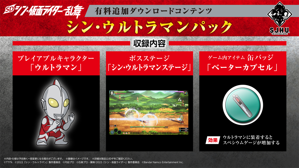 Nintendo Switch™/STEAM®対応ソフト「SD シン・仮面ライダー 乱舞」のシン・ジャパン・ヒーローズ・ユニバース(以下、S.J.H.U.)が集結する有料追加DLCのPV公開!また、有料追加DLC「エヴァンゲリオンパック」を4月13日(木)より配信開始しました。