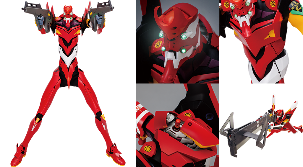 2号機を印象づける四つの眼は劇中のように鮮やかに発光。エントリープラグのハッチはリモコン操作によって自動開閉するなど豊富なギミックを搭載。胸部パーツは『新劇場版』バージョンと本田雄氏の設定画に基づいた2種類のバージョンが付属し、お好みに合わせて換装することが可能です。ほかにもプログレッシブナイフやボウガン、サンダースピアや2丁のパレットライフルなど2号機専用の兵装も付属。武器を持ち替えたり、両手もちのポーズも楽しめます。