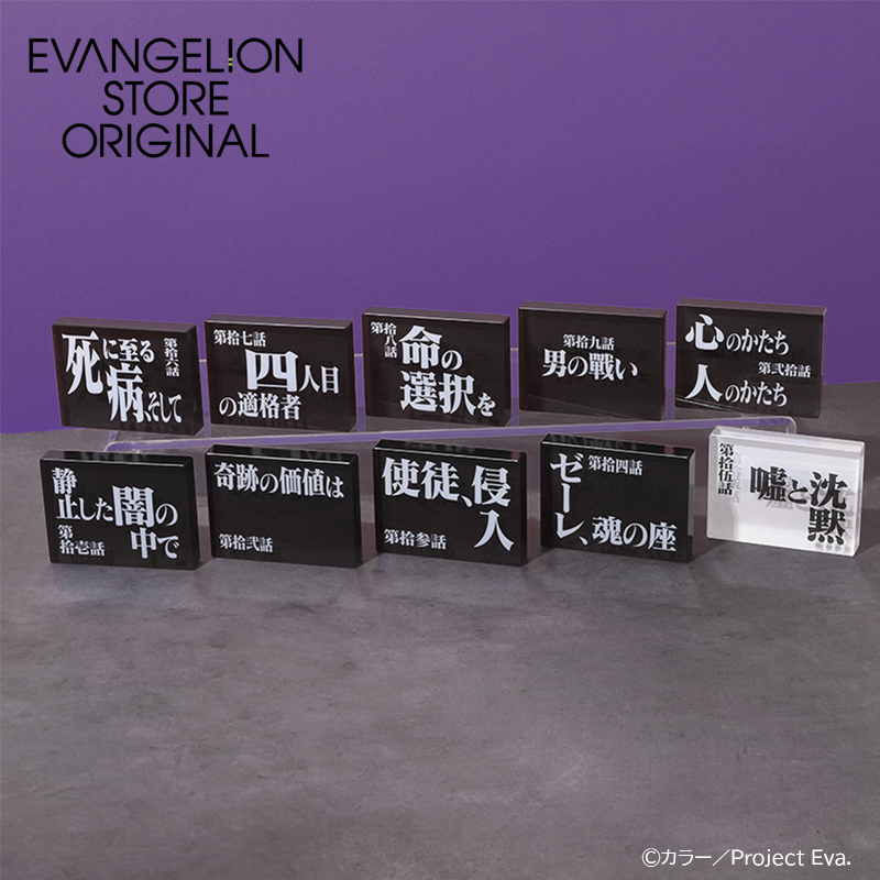 『新世紀エヴァンゲリオン』と『新世紀エヴァンゲリオン劇場版』のサブタイトルと「予告」などがそのままデザインされたミニサイズのアクリルブロックがVol.1、Vol.2、Vol.3と登場!