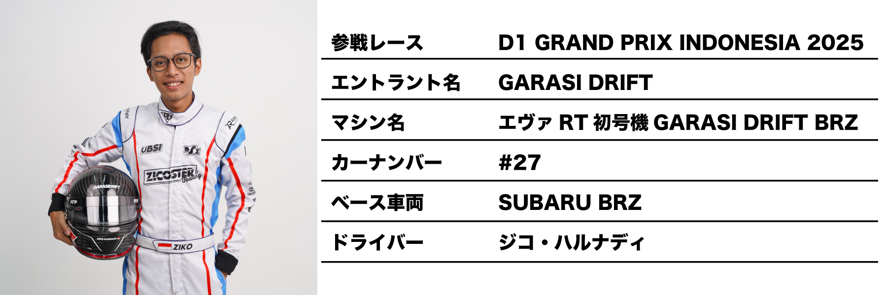 ドライバーは、GARASI DRIFTのオーナーでもあり、2024年のIDSシリーズチャンピオンにも輝いているインドネシア出身ドライバー「ジコ・ハルナディ」がマシンをドライブ。今大会でも優勝を目指します。