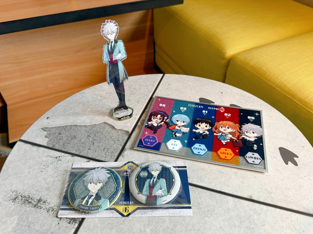 お持ち帰りできるアメニティも超豪華なんです〜っ!!!コンシェルジュ姿のカヲルくんのオリジナルアクリルスタンドにオリジナル缶バッジセット!さらに旅をしているミニキャラが可愛いオリジナルアクリル色紙!