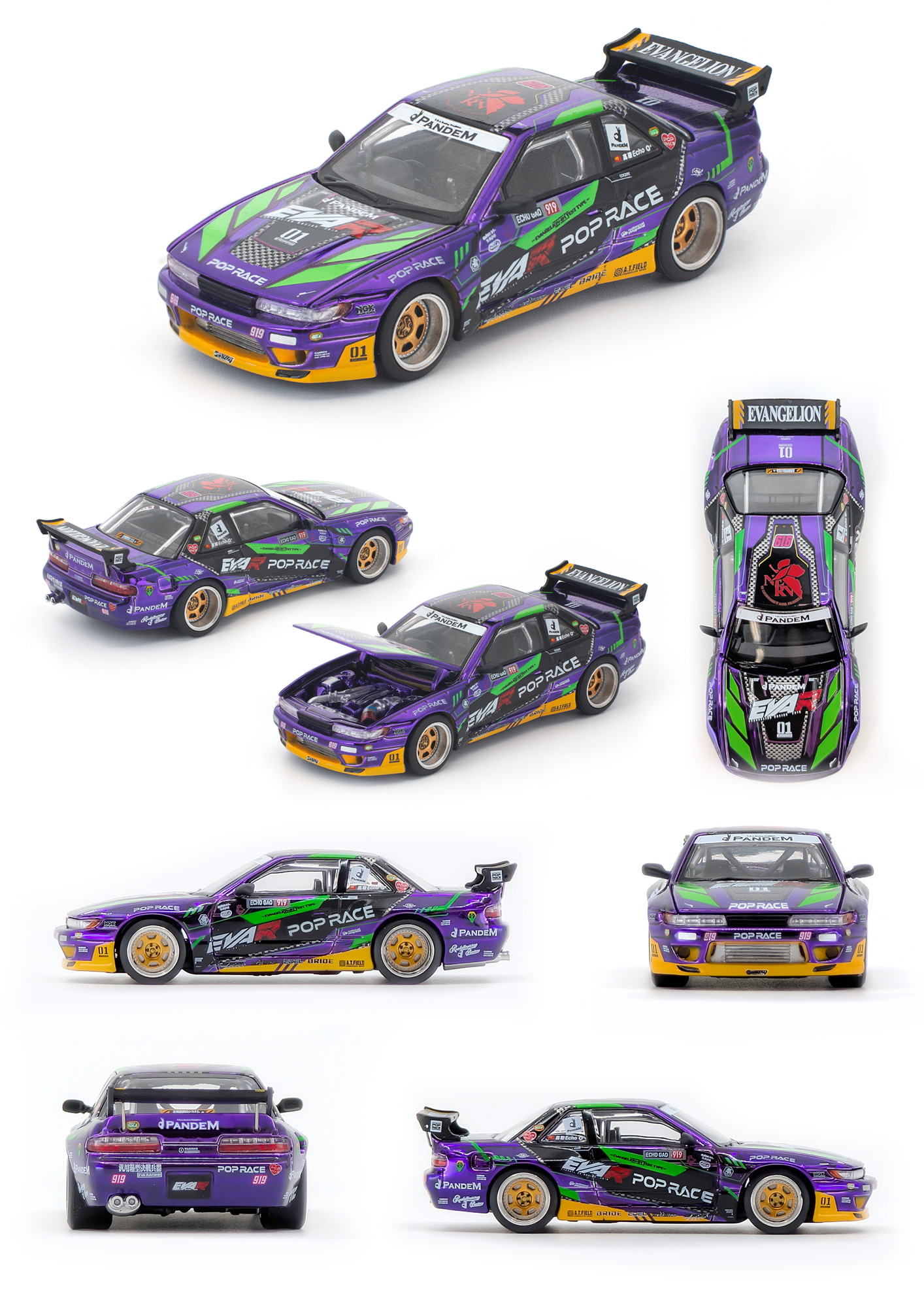 本商品は、エヴァンゲリオンレーシングが2025年に参戦している「FORMULA DRIFT JAPAN 2025」にて、シリーズに参戦中のエコー・ガオ選手がステアリングを握る「エヴァRT8号機 POP RACE × 1087X PANDEM S13」をモチーフに、エヴァンゲリオン初号機の紫と緑のカラーリングを施した、1/64スケールモデルです。また、2025年9月19日(金)~9月21日(日)に中国広東省佛山市で開催された展示会「APA XPO 2025 佛山改装展(POPRACEブース)」では初号機カラーの実車の公開も行われました。本商品のボディーには深みのあるクロームメッキを施し、さらにゴールドカラーのホイールを組み合わせた特別仕様。個性的なフロントバンパーやフェンダーで人気を誇る、エアロブランド「Pandem」によるワイドボディキットもリアルに表現。そのほか、フロントエンジンフードには開閉ギミックを搭載し、精密に作り込まれたエンジンルームも鑑賞できます。