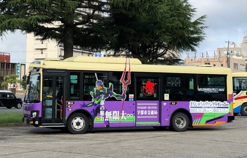ワイルドバンチフェスとのコラボ企画として誕生した、まちエヴァラッピングバスは、現在、主に宇部市内(山口市、山陽小野田市を含む)を運行しています。