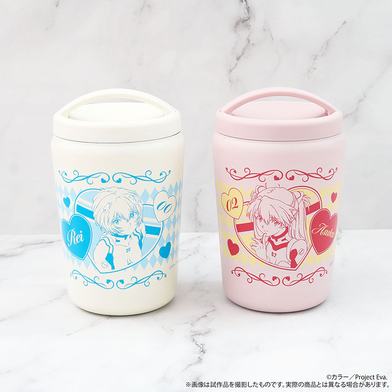描き下ろしイラストを使用した蓋つきタンブラーです。保温性に優れており、ハートマークに囲まれたアスカやレイが可愛いアイテムです♡