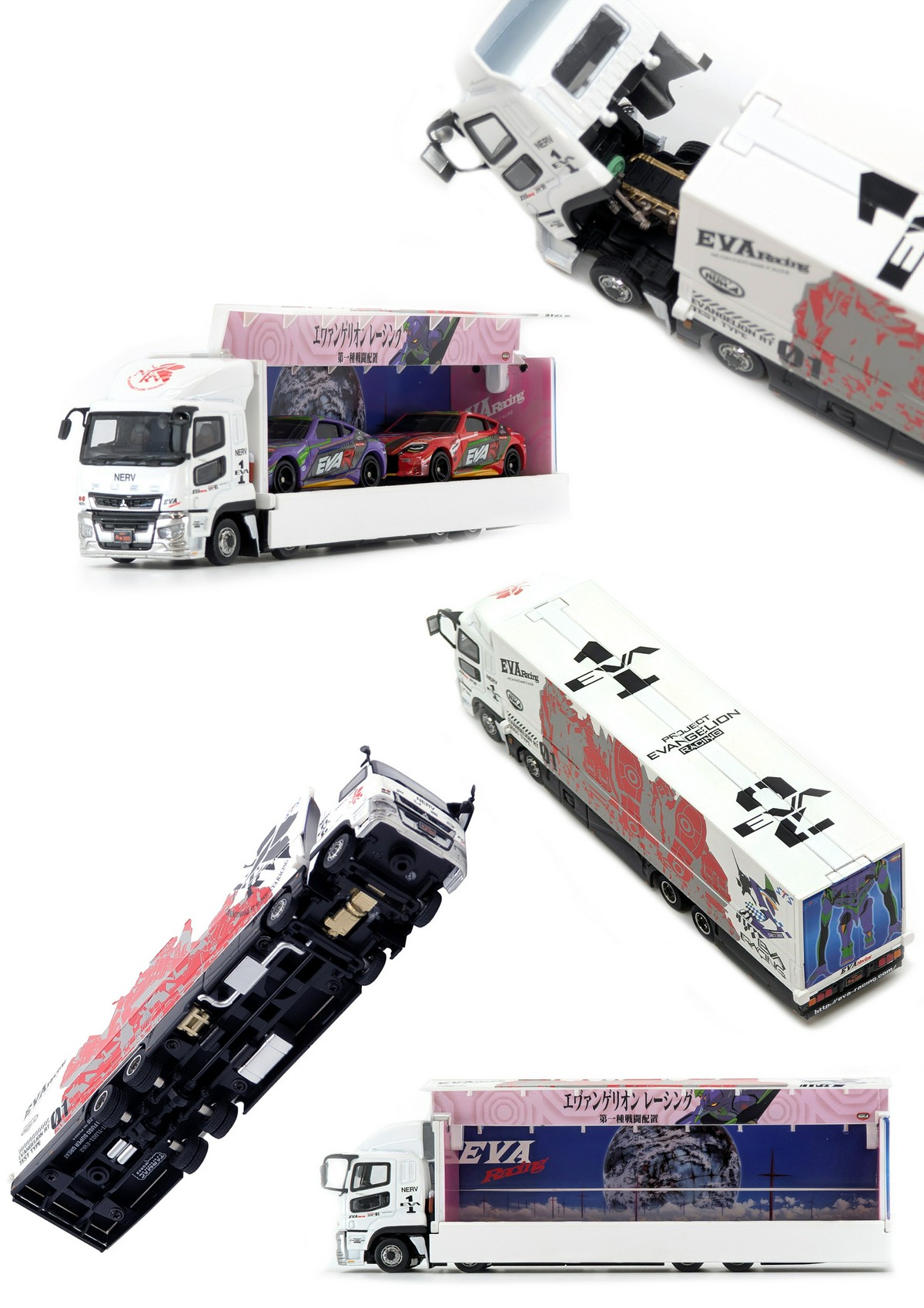 荷台の内装にもデザインも施されているため、荷台左ウィングを開くとステージトラックが再現されます。サーキット現地でエヴァレーシングステージをご観覧していた方にとっては、懐かしい景色が蘇ります。また、荷台には同1/64スケールのミニカーのディスプレイとしても活躍します。