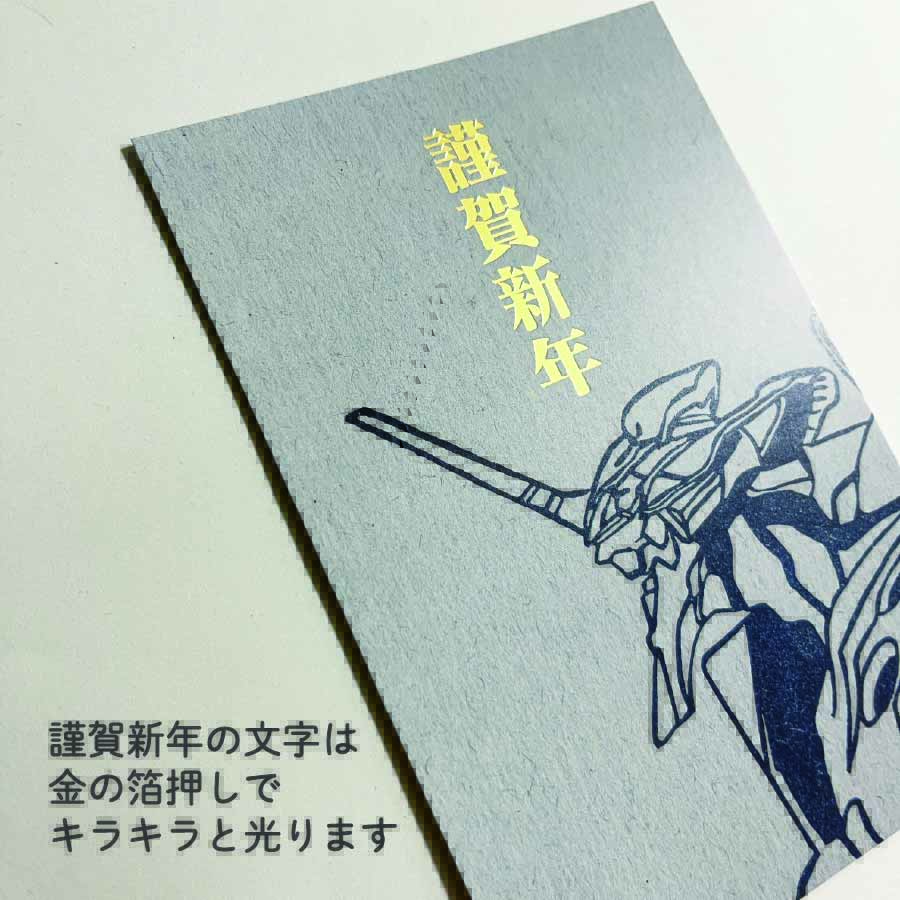 エヴァンゲリオンの初号機をモチーフにしたデザインが、特別な年賀状としての存在感を放ちます。