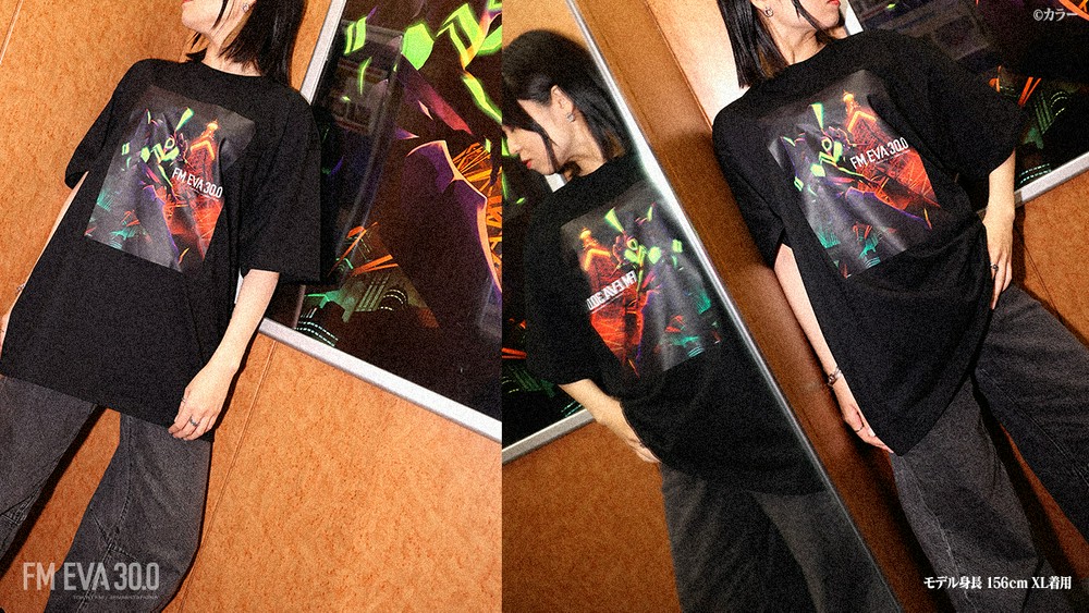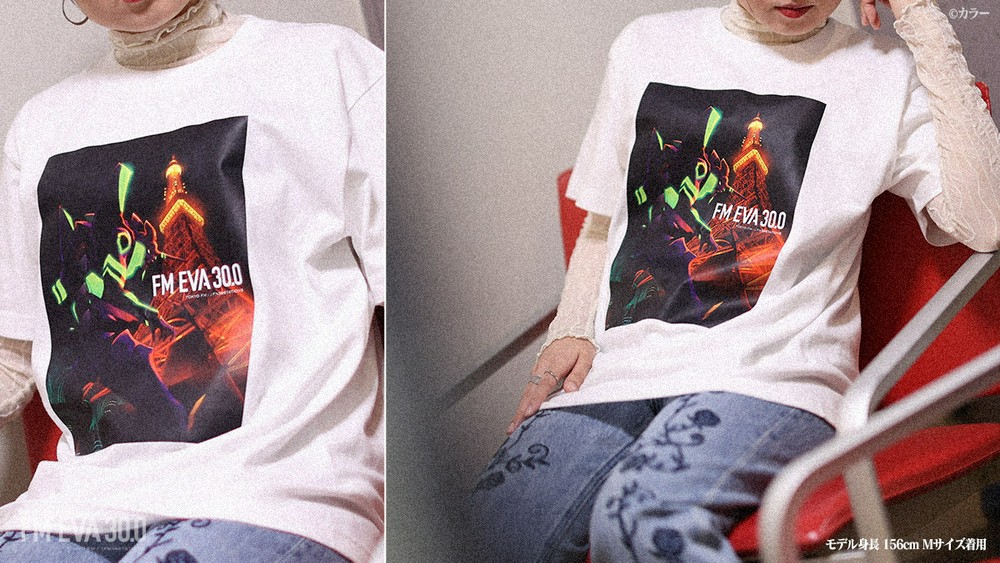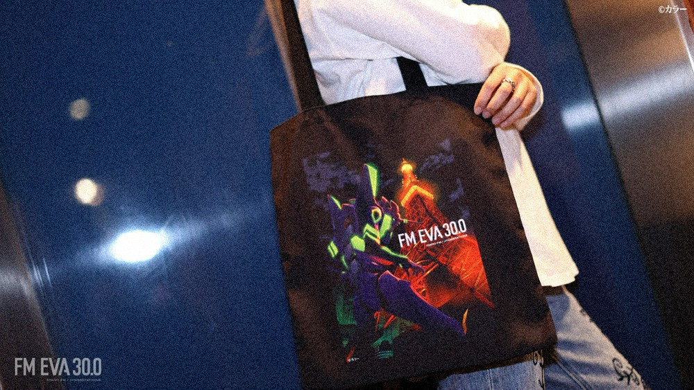 Tシャツは普段使いもしやすいブラックとホワイトをご用意しました。フロントには、夜の東京タワーと共にそびえ立つエヴァンゲリオン初号機のビジュアルを大胆にプリントしています。バッグの首元には、『エヴァンゲリオン』30周年記念ロゴとTOKYO FMのロゴがデザインされています。販売価格は5,000円(税込)となります。