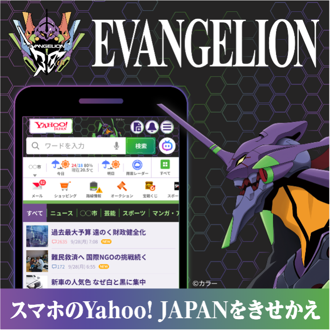 ・内 容:スマートフォン版「Yahoo! JAPAN」アプリ(iOS版、Android版)、スマートフォンブラウザー版「Yahoo! JAPAN」トップページと「Yahoo!検索」の検索結果ページのきせかえに、『エヴァンゲリオン』30周年記念のきせかえテーマが登場します。