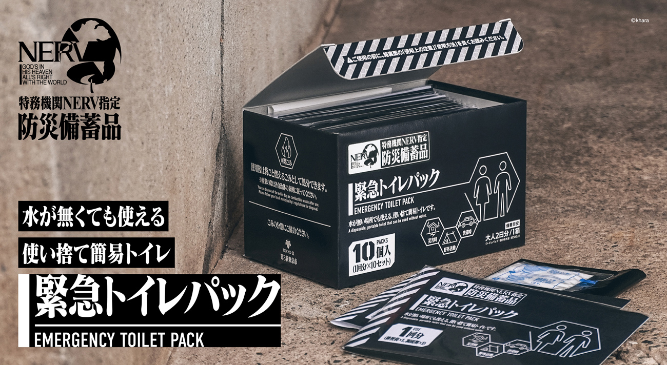 『エヴァンゲリオン』シリーズの意匠を取り入れた防災備蓄品を開発するプロジェクト「特務機関NERV指定防災備蓄品計画」から、水が無くても使える使い捨て簡易トイレ「特務機関NERV指定 緊急トイレパック 10個入」が登場します。