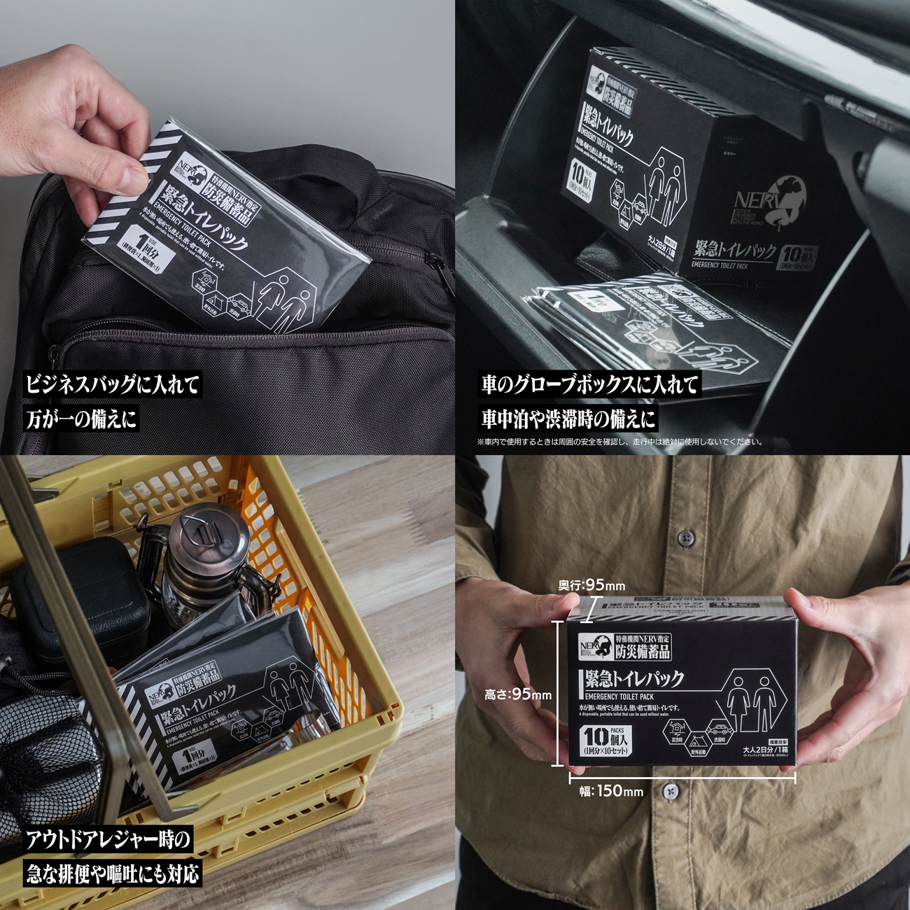 水が無い場所でも使える、使い捨て簡易トイレです。排泄物を凝固剤で固めることで、災害時など水が用意できない場合でも処理が可能となります。渋滞中の車内やアウトドアレジャー時の急な排便や嘔吐にも対応可能です。「特務機関NERVから第3新東京市民に配られる備蓄品」をコンセプトとした、まるで劇中から出てきたようなデザインで『エヴァンゲリオン』シリーズファンの方に作品の世界観を楽しんで頂く一方で、食品や照明といったカテゴリーに比べ備蓄が進んでいないとされる「災害時のトイレ」を考えるきっかけになるアイテムとして企画されました。