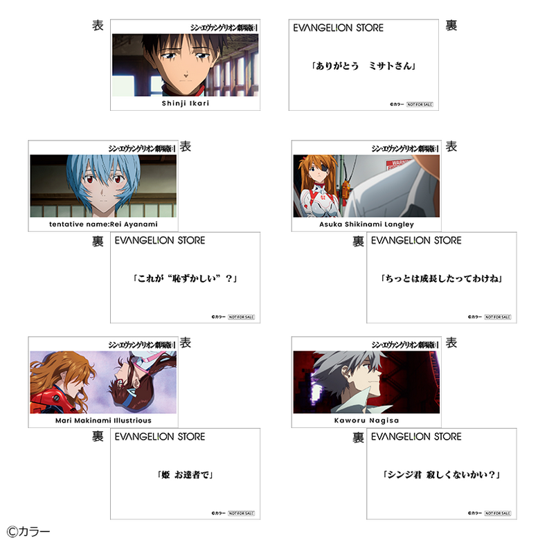 EVANGELION STORE(オンライン)、EVANGELION STORE TOKYO-01(池袋)、箱根湯本えゔぁ屋(箱根)にて、3,000円(税込)お買い上げごとに、「特典カード(全5種)」をランダムで1枚プレゼント!